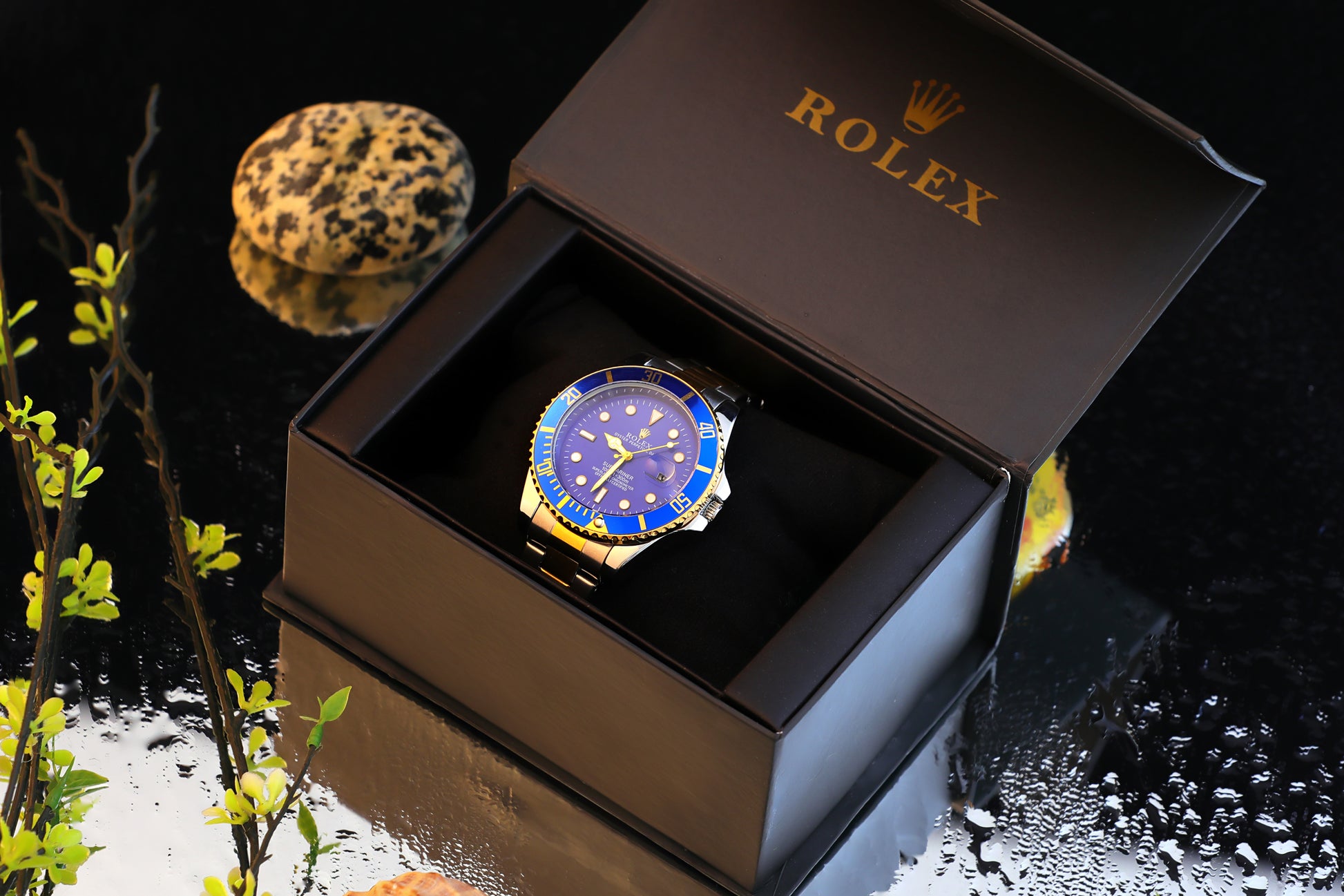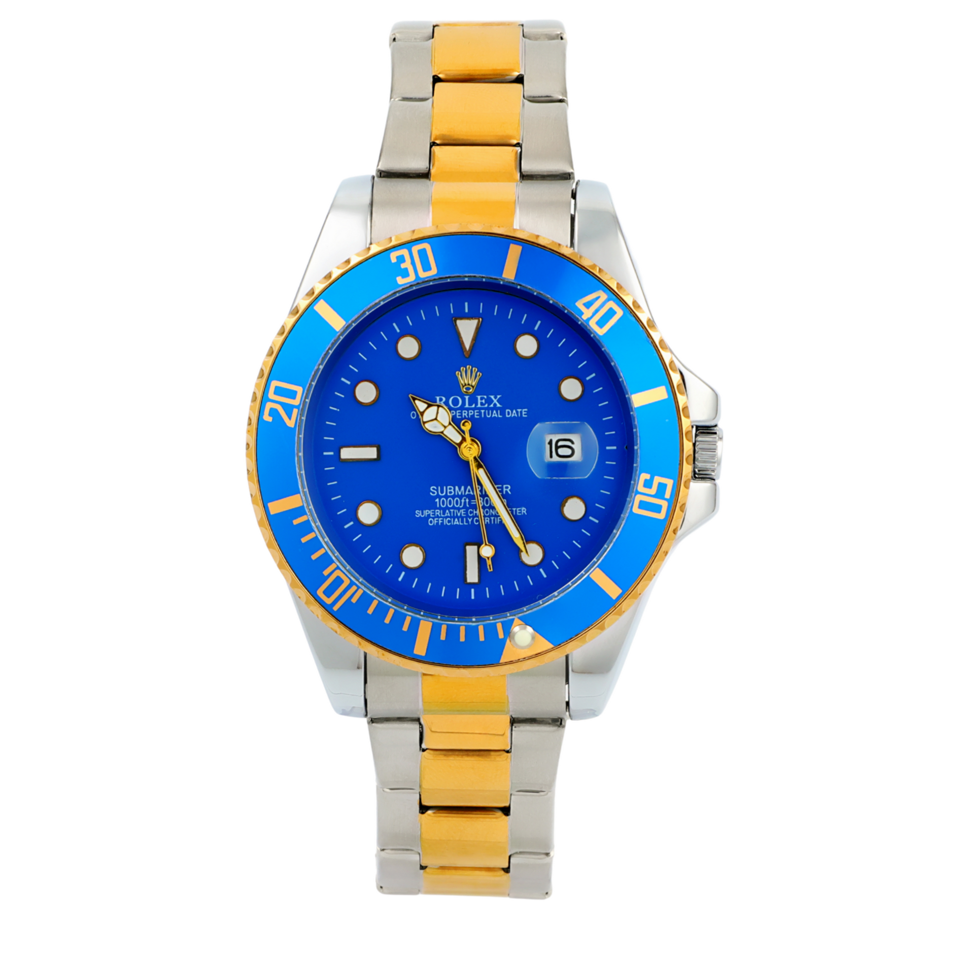 Make a confident statement with the Two-Tone Blue Dial Edition — a masterful combination of sport and luxury. The striking sunburst blue dial is framed by a gold-tone rotating bezel and housed in a silver-and-gold stainless steel case. Paired with an automatic date function and luminous hands, this watch is as practical as it is prestigious. Comes securely packed in an elegant box, ready for display or gift presentation.